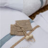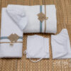 Βαμβακερό σετ λαδόπανου σε λευκό χρώμα με διακοσμητικές τρέσες σε σιέλ και μπεζ χρώμα, απλικέ ψάθινοι διακοσμητικοί ρόμβοι και φιογκάκι με ξύλινες χάντρες.Πετσέτα 70*140*360g. OEKO-TEX STANDARD 100