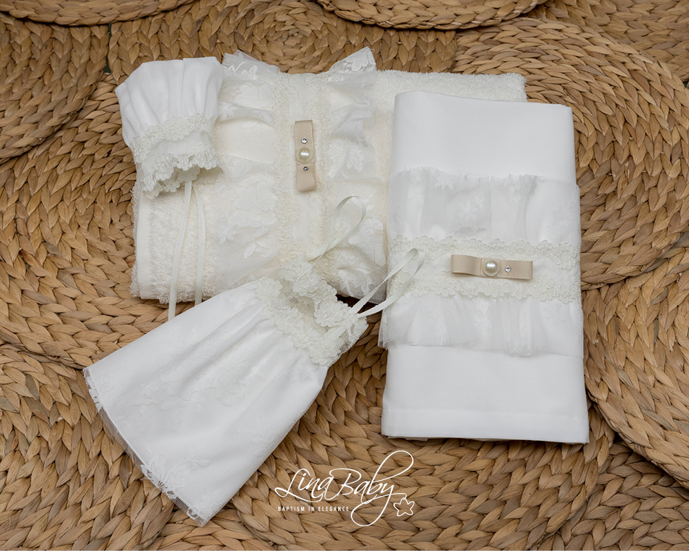 Βαμβακερό σετ λαδόπανου σε ιβουάρ χρώμα με διακοσμητική φάσα υφάσματος και γκρο κορδέλα. Πετσέτα 90*140*360g. OEKO-TEX STANDARD 100